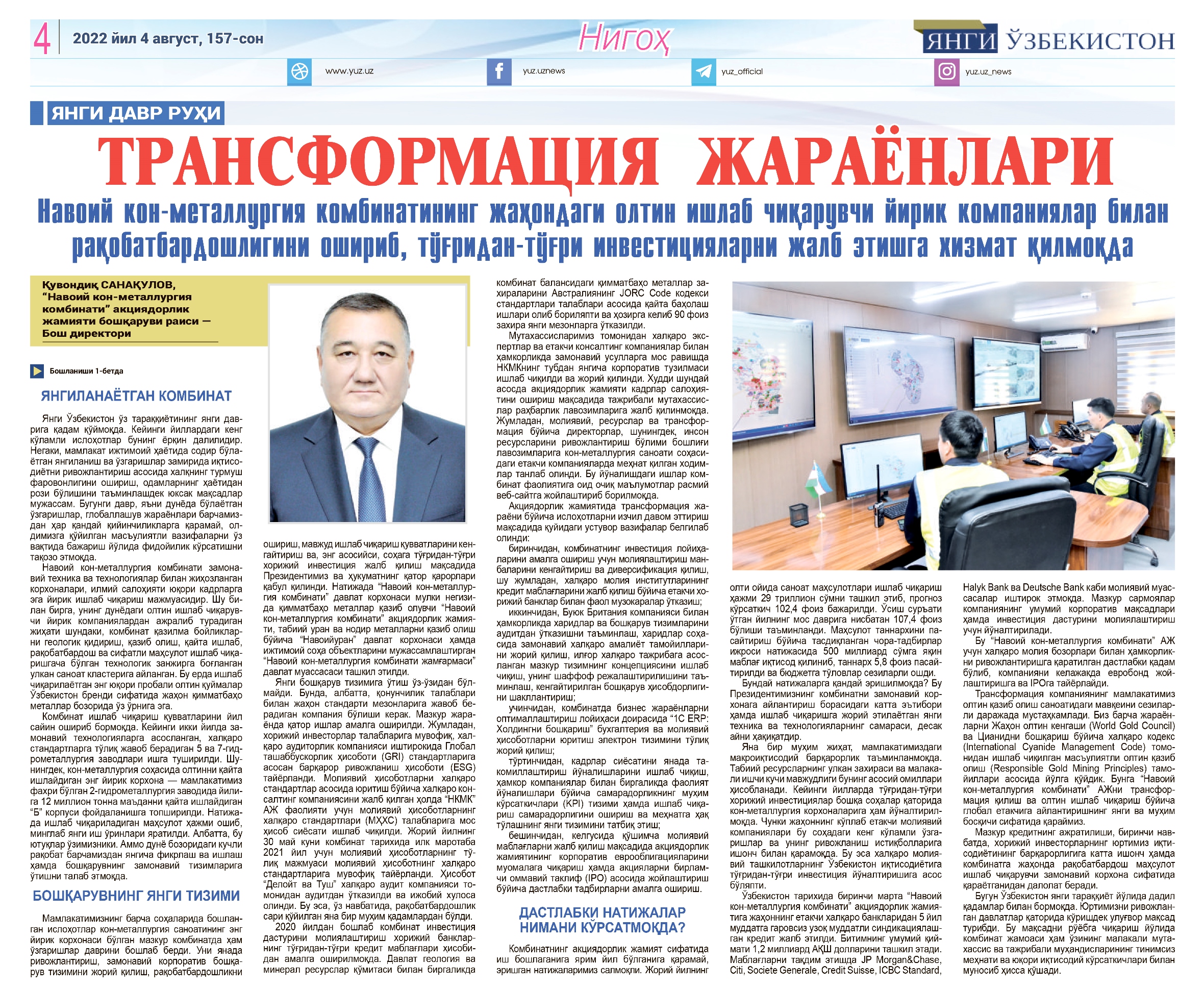 There was published an article of the Chairman of the Management Board – Director General of “Navoi Mining and Metallurgical Company” Joint-Stock Company, member of the Senate of the Oliy Majlis K. Sanakulov about the transformation processes that serve to increase the competitiveness of Navoi Mining and Metallurgical Company with the world's largest gold producing companies and attract direct investment in the newspaper "Yangi O‘zbekiston" (№157, August 4, 2022).