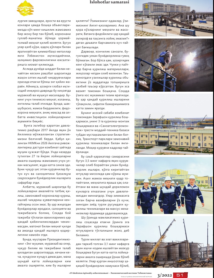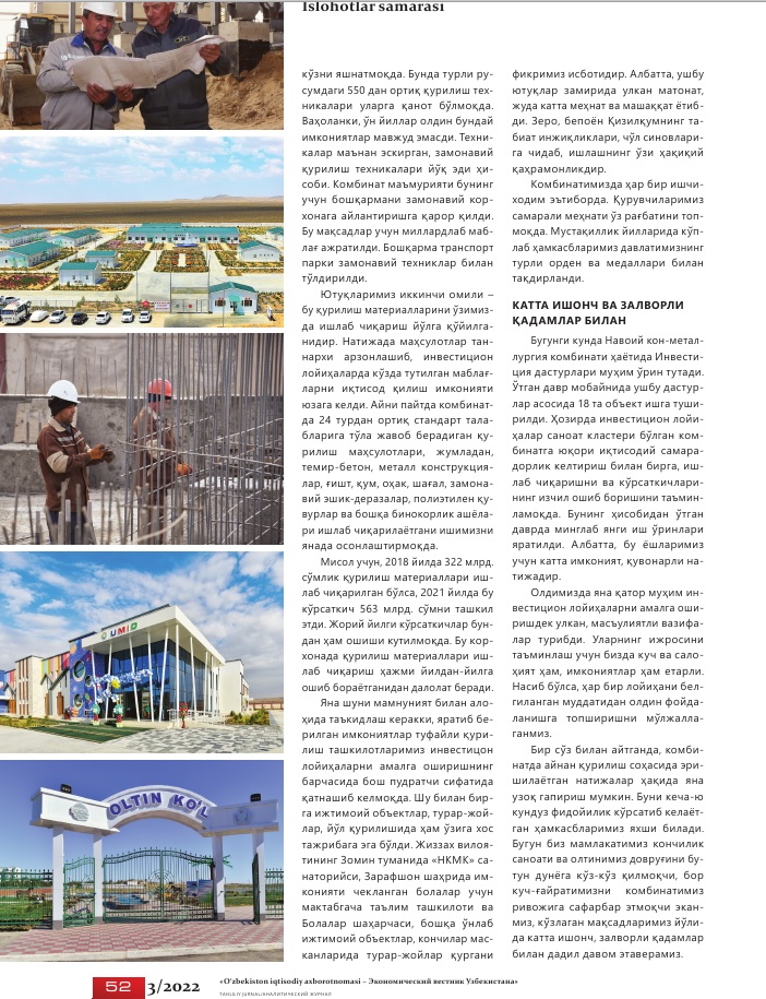 The analytical magazine "Economic Bulletin of Uzbekistan" (№3, 2022) published an article by Director for project management and capital construction of JSC NMMC F. Bahranov on the implementation of investment projects at the enterprise.
