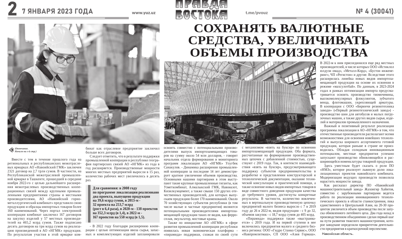 The newspaper "Pravda Vostoka" (№4, January 7, 2022) published an analytical article about the work carried out in Joint Stock Company Navoi Mining and Metallurgical Company for localization and expanding intersectoral production cooperation relations.