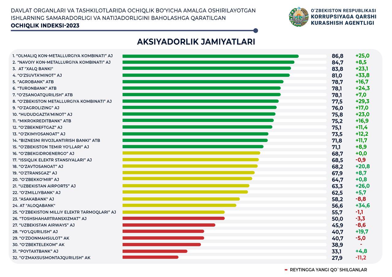 The Anti-Corruption Agency of the Republic of Uzbekistan announced the results of the Openness Index 2023, aimed at assessing the effectiveness and efficiency of the work done on openness in government agencies and organizations.