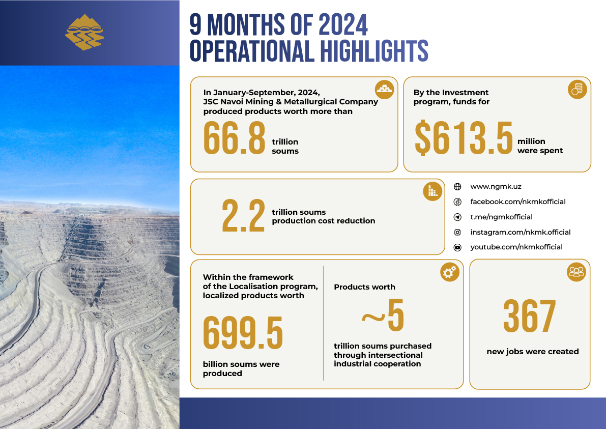 In January-September, 2024, JSC Navoi Mining and Metallurgical Company produced products worth more than 66.8 trillion soums.