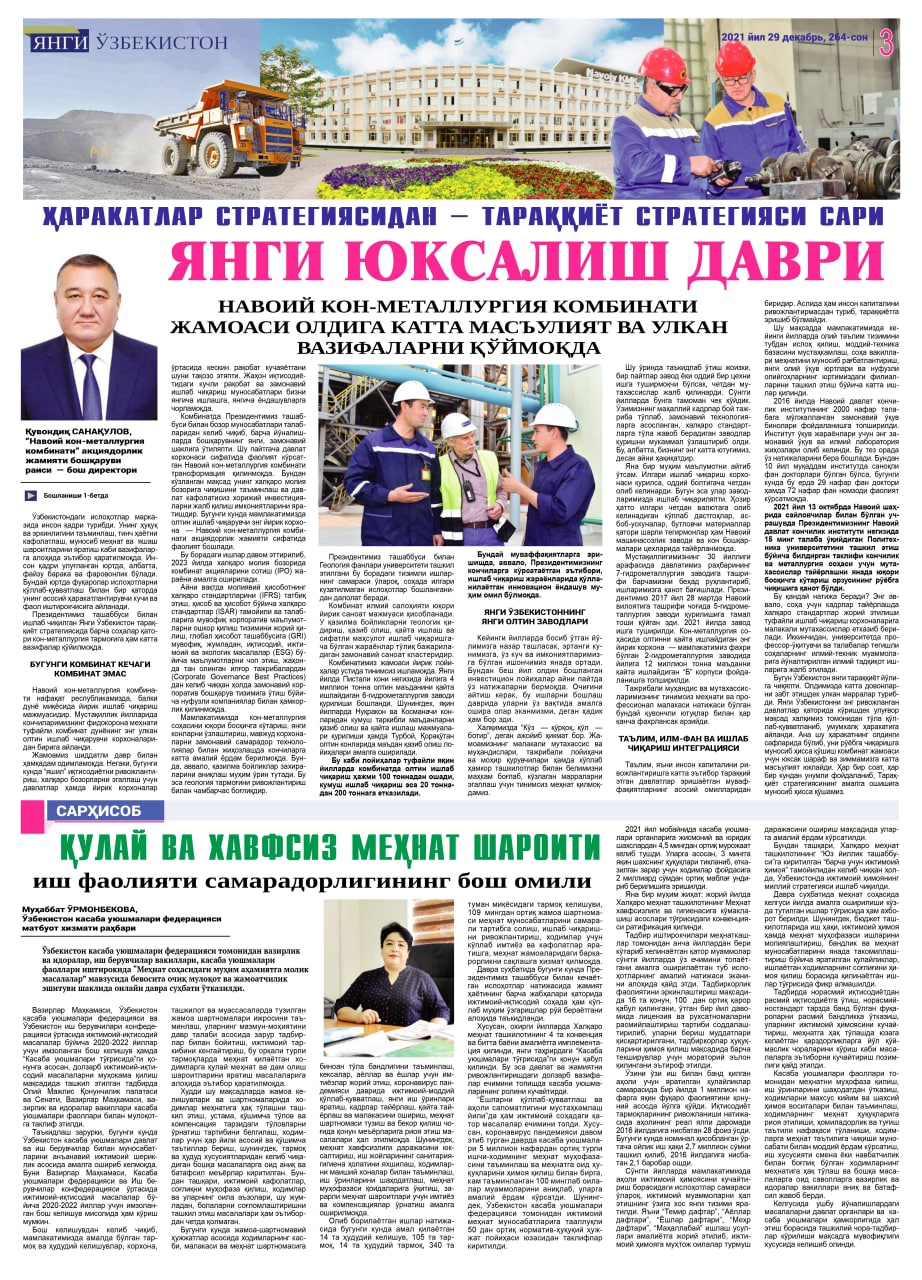 There was published an article of the Chairman of the Management Board – Director General of “Navoi Mining and Metallurgical Company” Joint-Stock Company K. Sanakulov in the newspaper "Yangi O‘zbekiston" (№264, December 29, 2021).