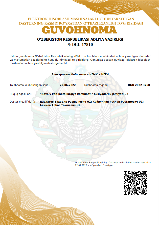 The right holder of these information systems is “NMMC” JSC, and the authors are head of IT Department B. Davlatov, the deputy head of IT Department for the introduction of digital technologies R. Khairullin, head of branch of IT Department Zh. Mavlonov, software engineer of IT Department A. Alimov.