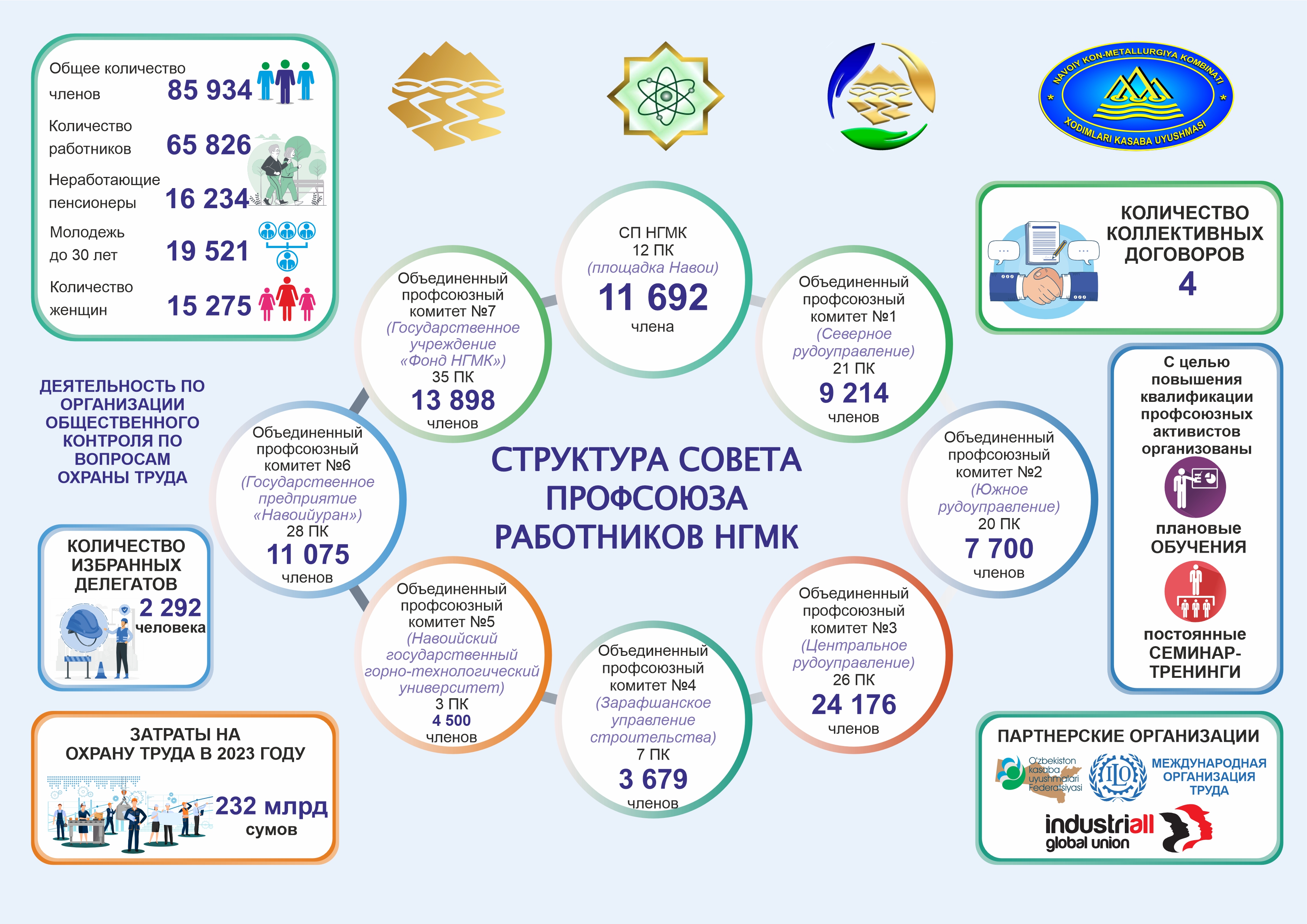 Особое внимание уделяется социальной защите свыше 56,4 тысяч работников и неработающих пенсионеров Акционерного общества «Навоийский горно-металлургический комбинат», 11 тысяч работников Государственного предприятия «Навоийуран», 13,8 тысяч работников Государственного учреждения «Фонда НГМК», а также более 4,5 тысяч преподавателей и студентов Навоийского государственного горно-технологического университета. Эту работу осуществляют Совет профсоюза работников НГМК и его 7 объединенных профсоюзных комитетов, 152 первичных профсоюзных организаций.