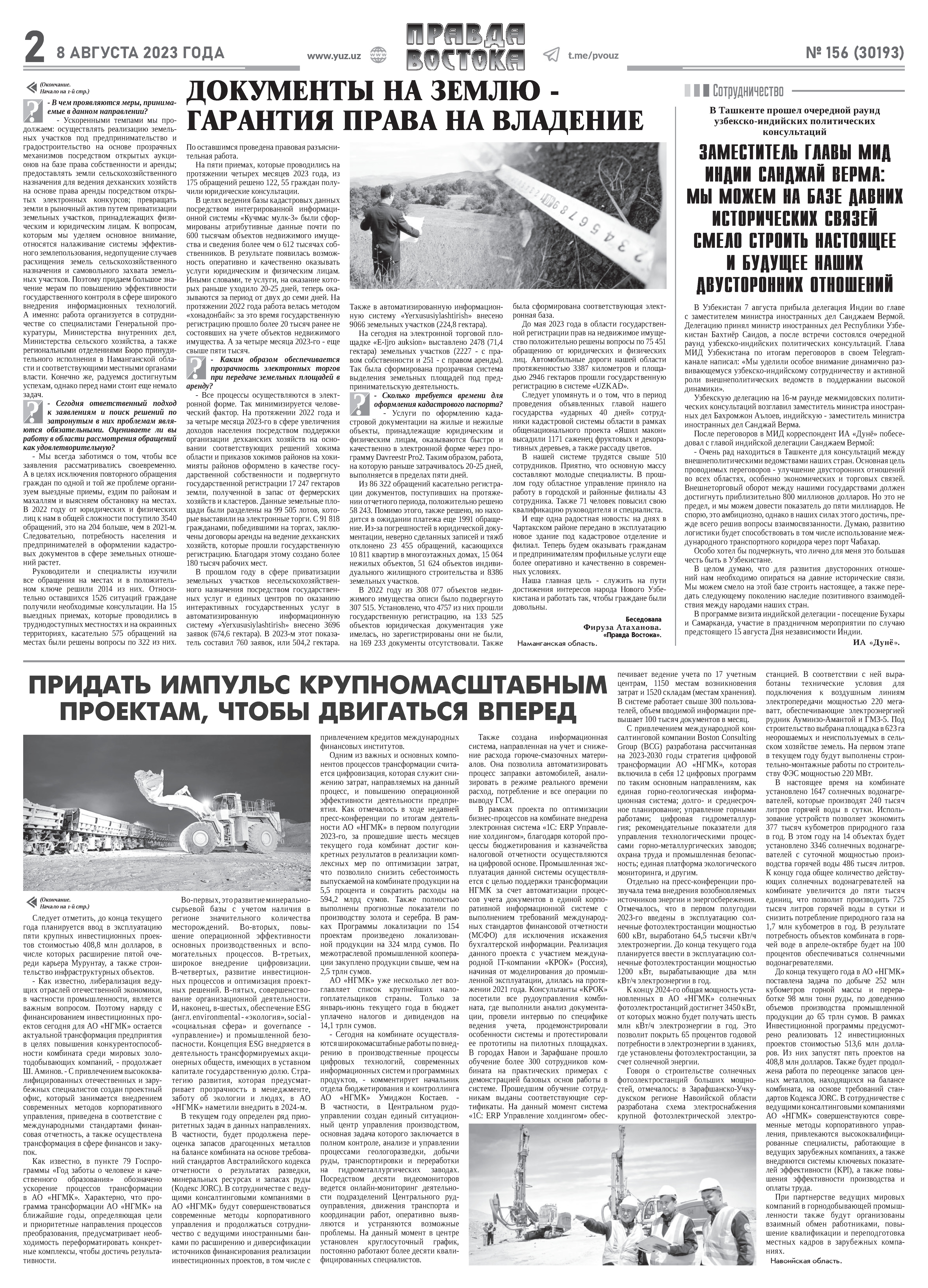 В газете "Правда Востока" (№156 от 8.08.2023 года) под заголовком "Придать импульс крупномасштабным проектам, чтобы двигаться вперёд" напечатана аналитическая статья, посвящённая итогам деятельности Акционерного общества «Навоийский горно-металлургический комбинат» за первое полугодие 2023 года.