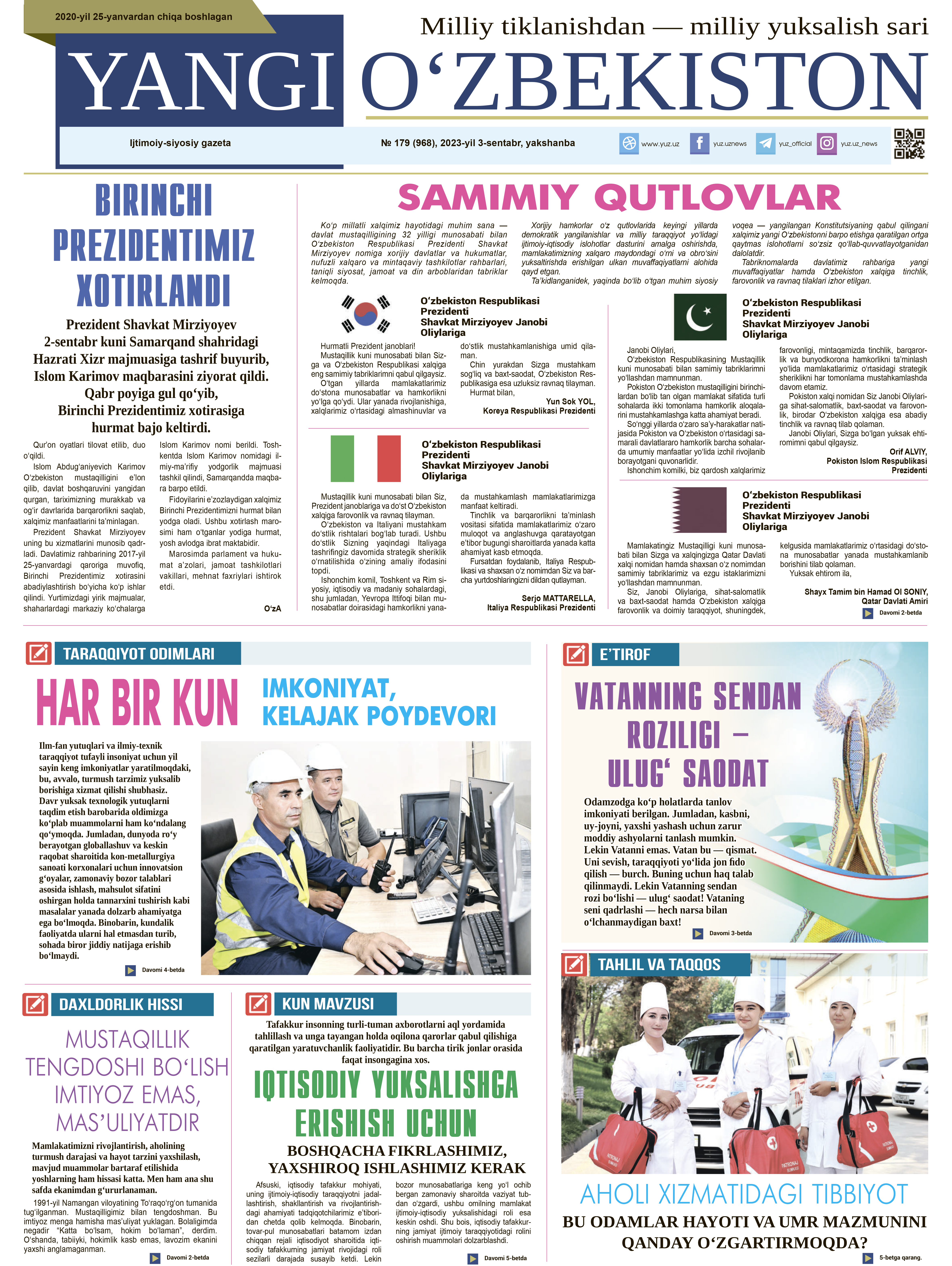 В газете "Янги Ўзбекистон" (№179 от 3.09.2023 года) в честь 32-й годовщины государственной независимости Республики Узбекистан напечатана статья председателя правления – генерального директора АО «НГМК» Кувандика Санакулова.