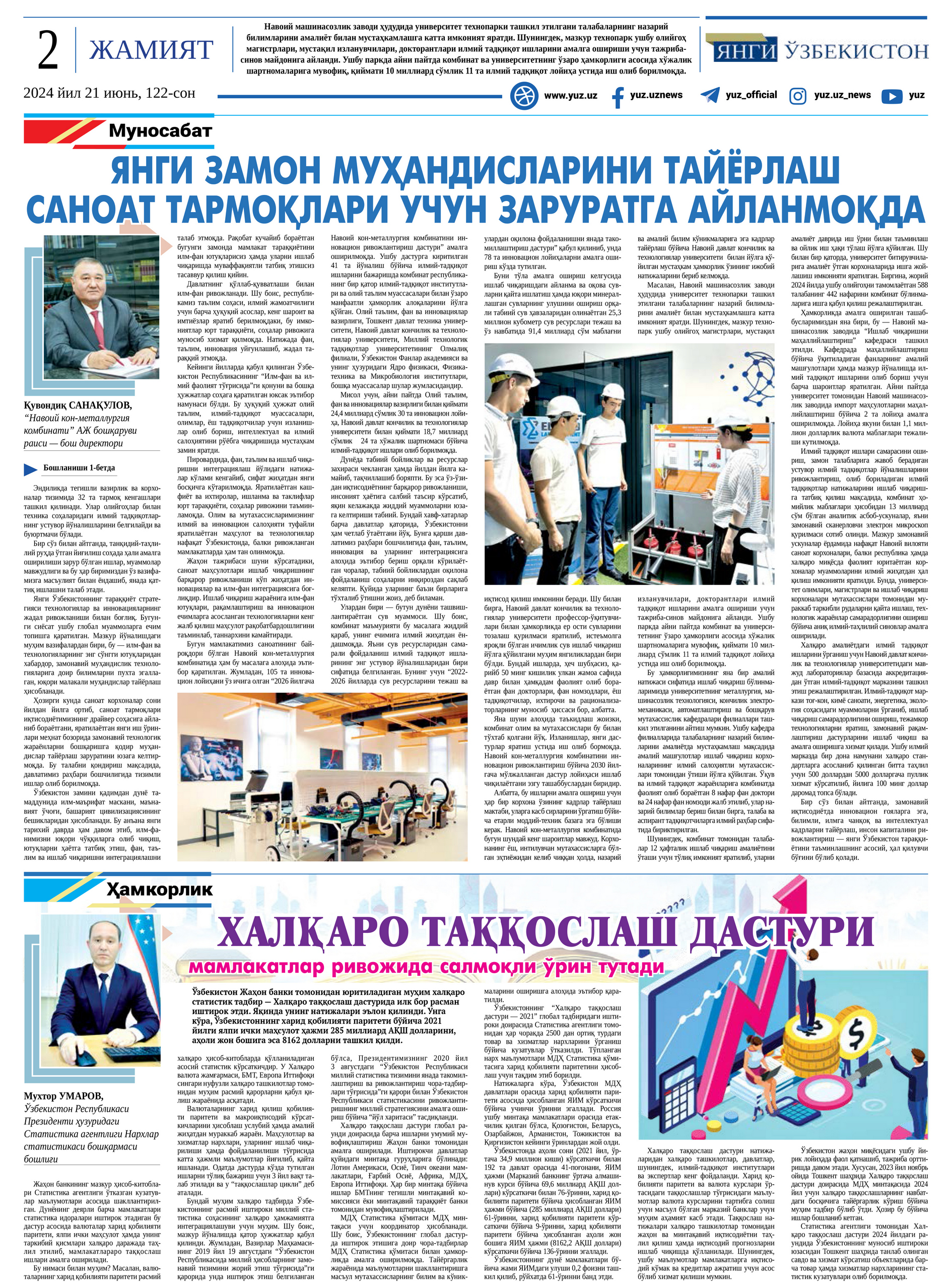 Газета "Янги Ўзбекистон" (№122 от 21.06.2024 года)