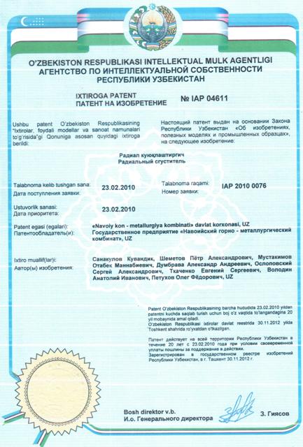 Новая конструкции сгустителя защищена патентом РУЗ IAP 04611. Имеется «ноу – хау». Передача конструкции и «ноу – хау»возможна только по лицензионному соглашению.