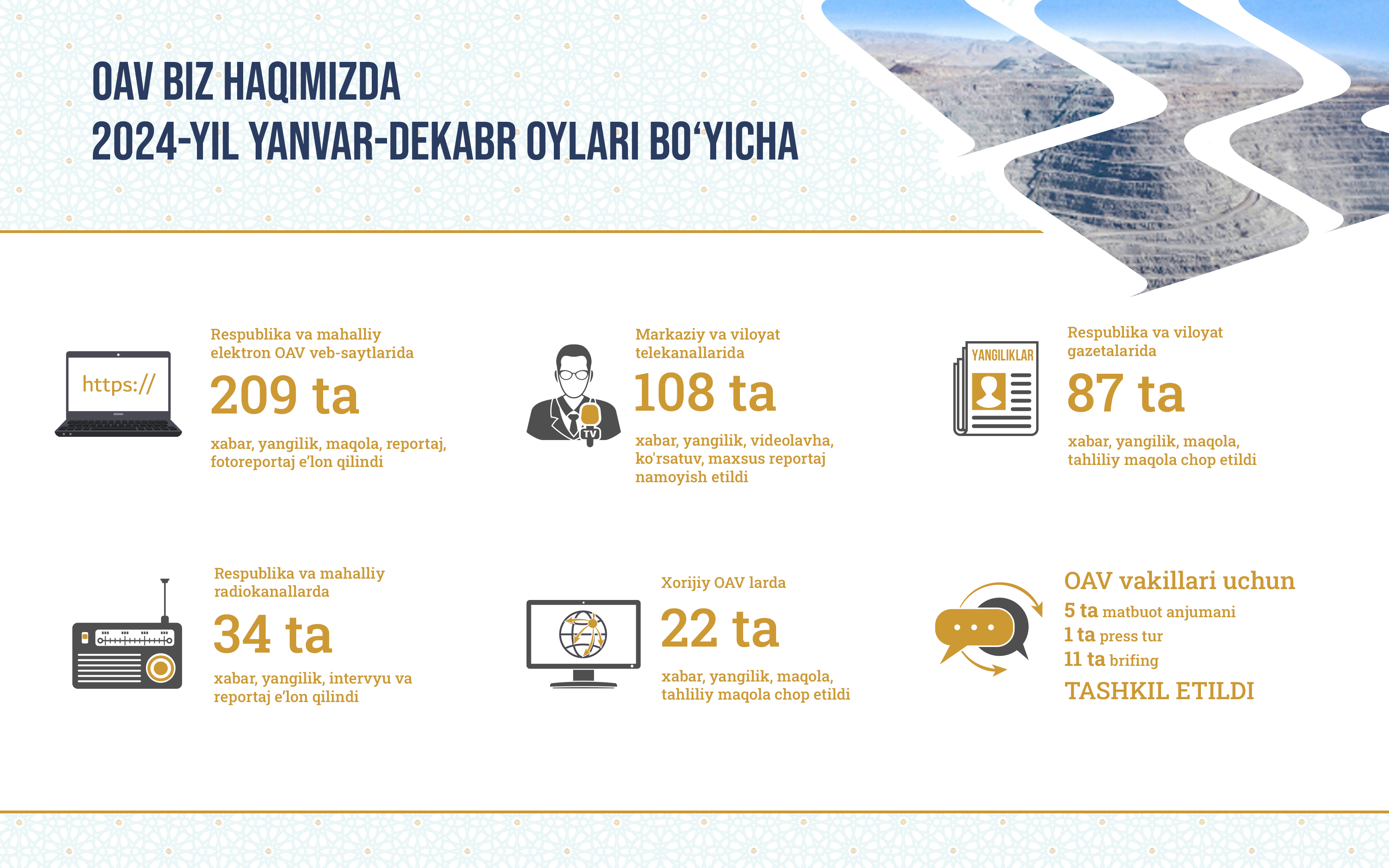 2024-yilning yanvar-dekabr oylarida Respublika va mahalliy elektron OAV veb-saytlarida 209 ta xabar, yangilik, maqola, reportaj, fotoreportaj elon qilindi.
